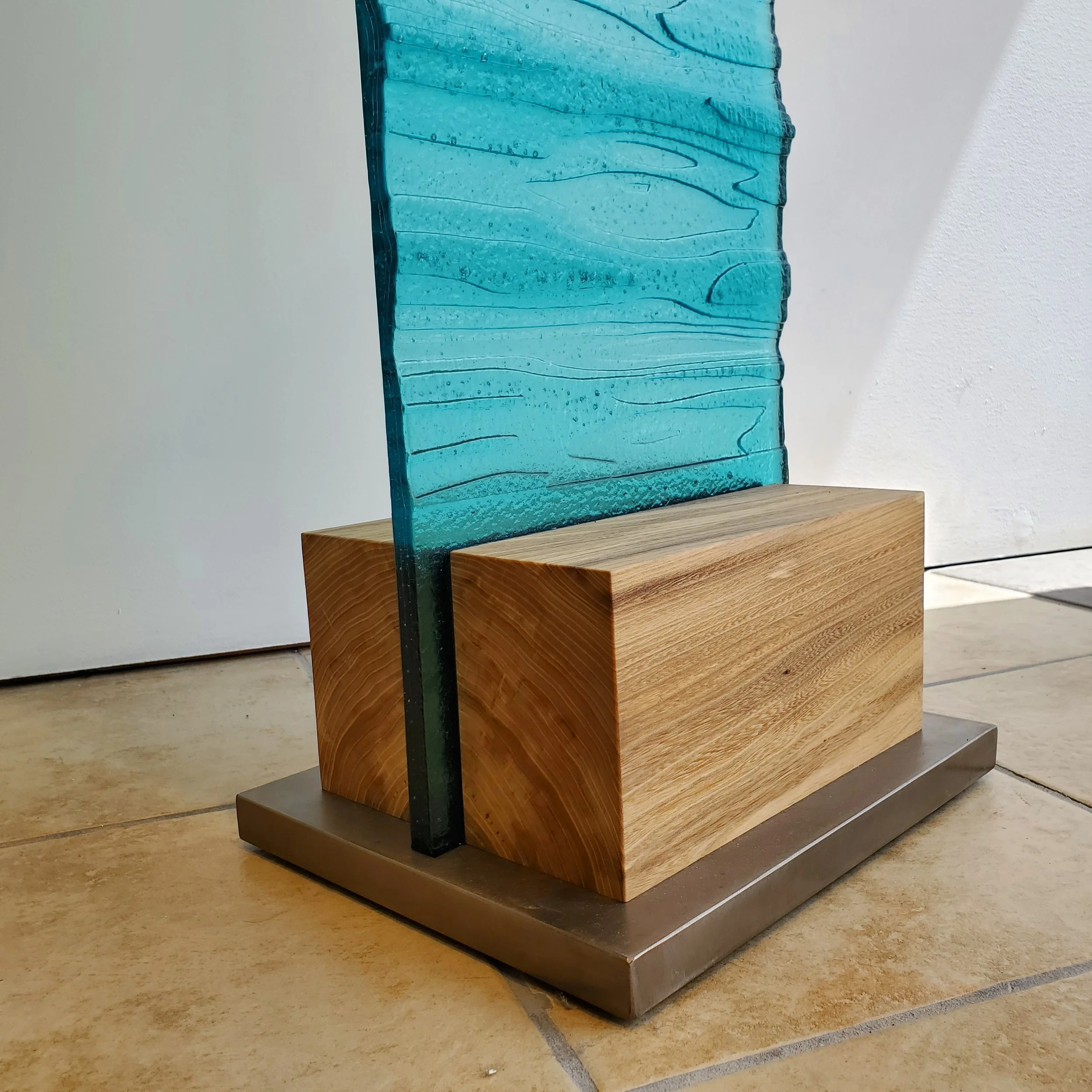 Levels is a striking combination of fused glass, wood and steel which stands a meter high.